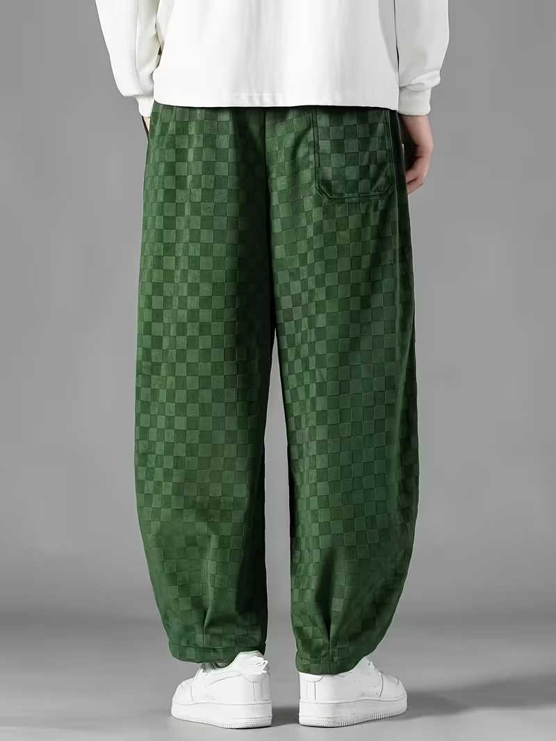 These men's pants feature a wide-leg fit with an elastic waistband and drawstring adjustment. The fabric is designed with an all-over checkered pattern. Side pockets provide convenience, and the legs have a loose, slightly tapered shape.